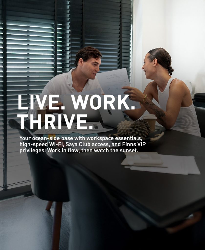 Your ocean-side base with workspace essentials, high-speed Wi-Fi, Saya Club access, and Finns VIP Privileges. Work in flow,…